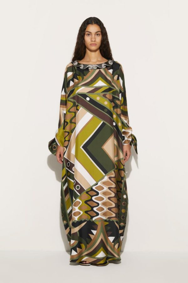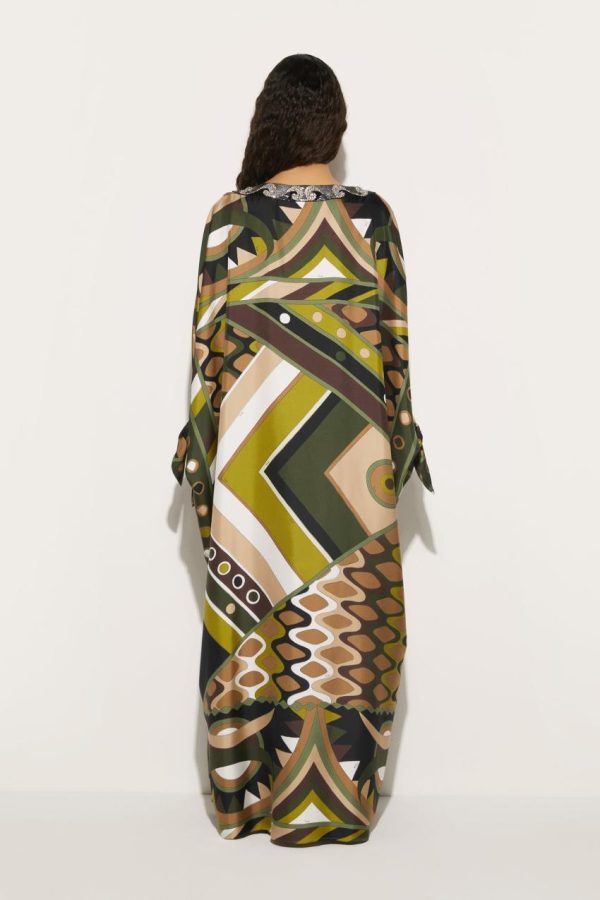 This kaftan is an elevated take on Pucci’s signature billowing silhouettes. It’s cut to a maxi-length design and is fitted with self-tie cuffs that can be styled into bows. The Vivara print adds a characteristically bold spin while the bead detailing at the neckline adds a touch of shine.