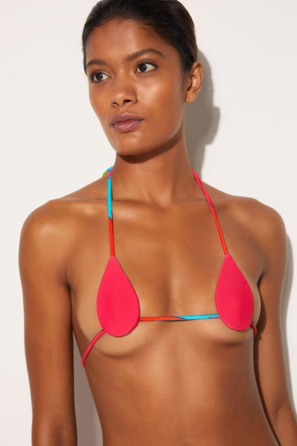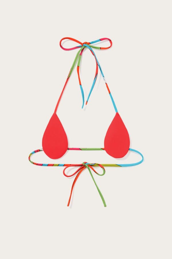 This bikini top signifies Camille Miceli’s youthful take on Pucci’s house codes. Ultra-slim straps are decorated with the colourful Iride print and complete with small teardrop-shaped covers.