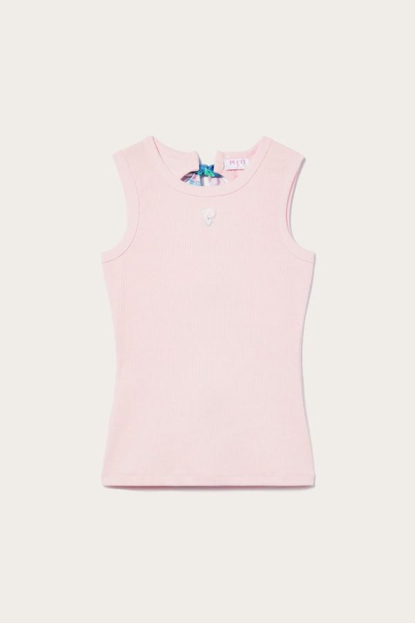 The front of this pale-pink top is simple, but the back tells another story: it’s detailed with two circular cut-outs secured by Iride-print self-ties. The signature intertwining fish logo sits just below the neckline for a dose of branding.