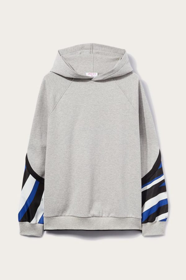 Camille Miceli offers Pucci’s energetic take on the classic hoodie. Bold curved seams are inspired by retro sportswear, while the Iride print’s rays dance at the lower arm.