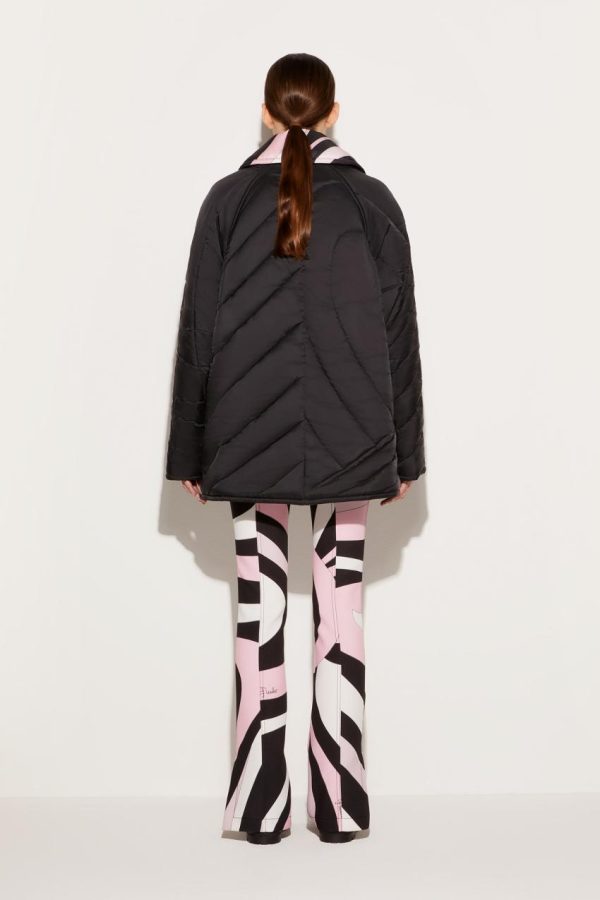 Camille Miceli offers a new way to wear the storied Iride pattern, applying its elliptical lines to this coat’s quilting. The print itself adorns the lining and oversized notch lapels, while engraved gold-tone buttons add a final Pucci flourish.