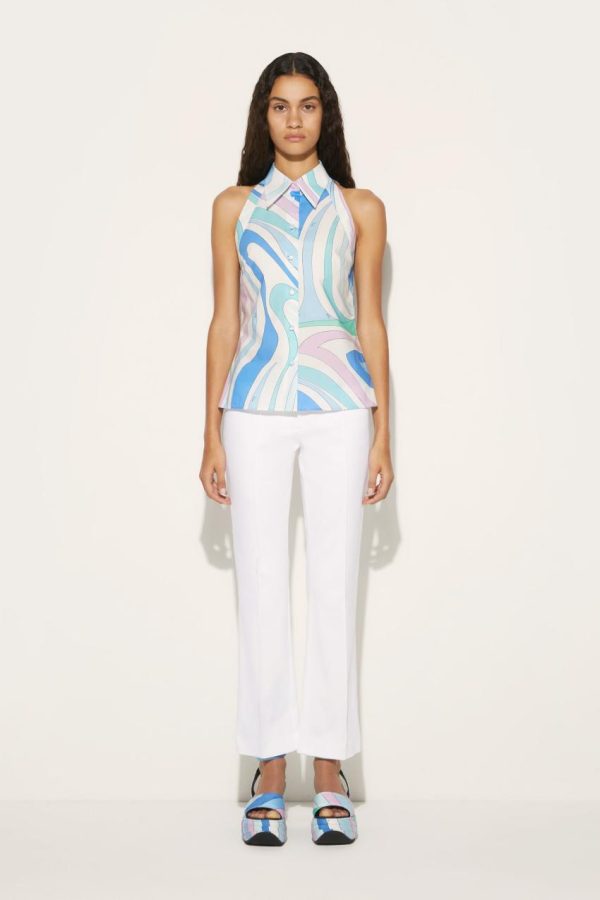 Spotlighting Pucci’s playful design direction, this shirt is reworked to a sleeveless silhouette. It’s decorated with the Marmo print’s marbled waves in blue and pink hues.