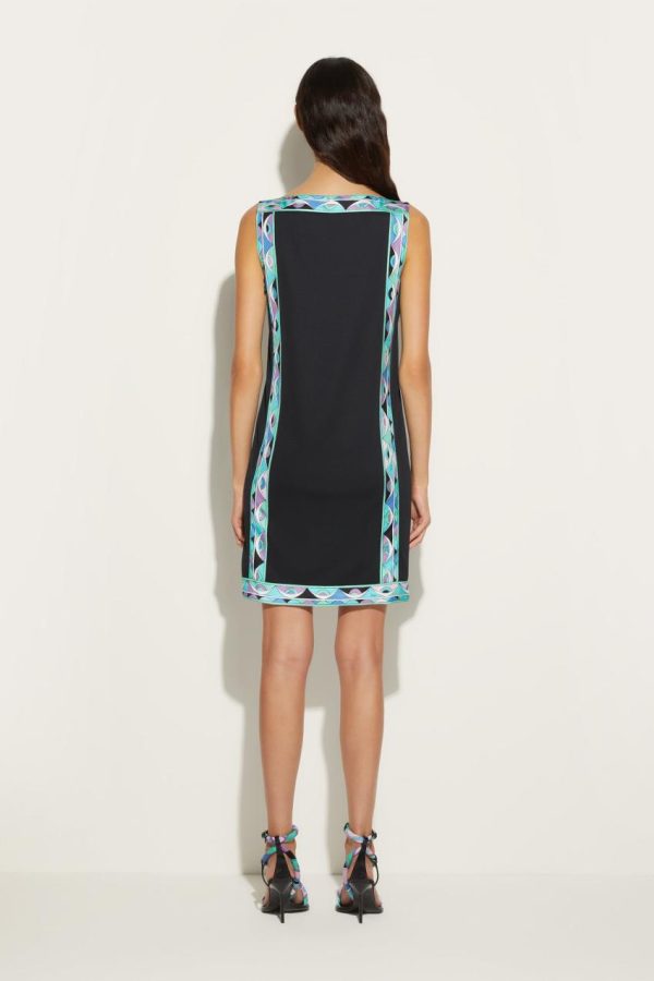 This black shift dress is cut from fluid jersey crepe to a clean, minimalist silhouette. Pucci’s famed pattern play shines at the edges, which are framed with an intricate pastel-hued Vivara print.