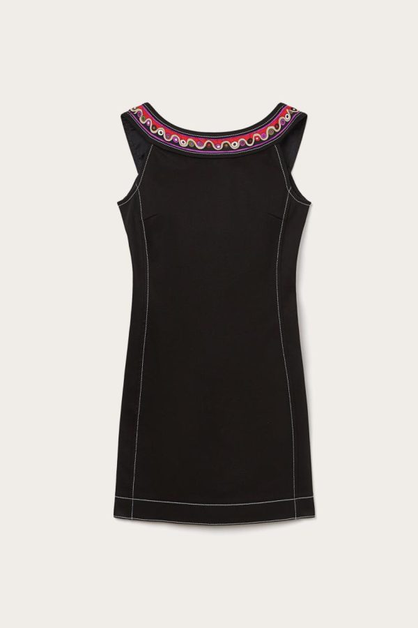 Camille Miceli infuses the classic shift silhouette of this dress with Pucci’s storied pattern play. The signature boat neck and back are decorated with a refreshed version of the Onde print, which was first seen in 1964.