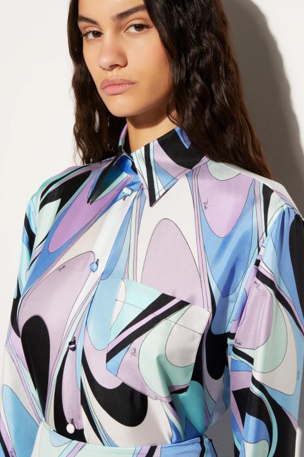This silk shirt displays Pucci’s mastery in transforming classic designs with bold, impactful patterns. The vibrant archival Onde print elevates the timeless silhouette into a statement piece.