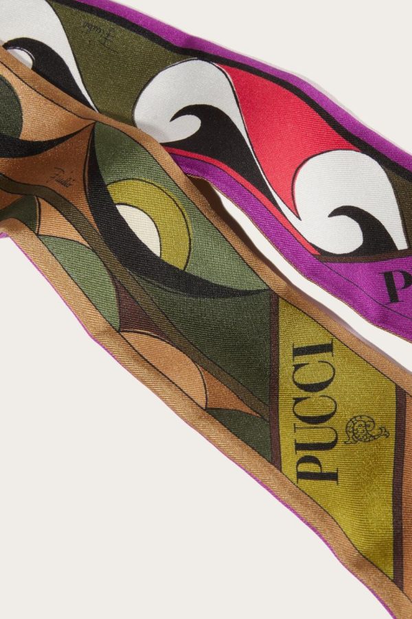 This scarf carries Rombi print, showcasing that captivating pattern is Pucci’s signature. It’s cut from silk twill to a slim shape and bordered with logos: note the house moniker and intertwined fish motif. Consider it knotted to a bag handle, tied at the neck or worn as a headband.