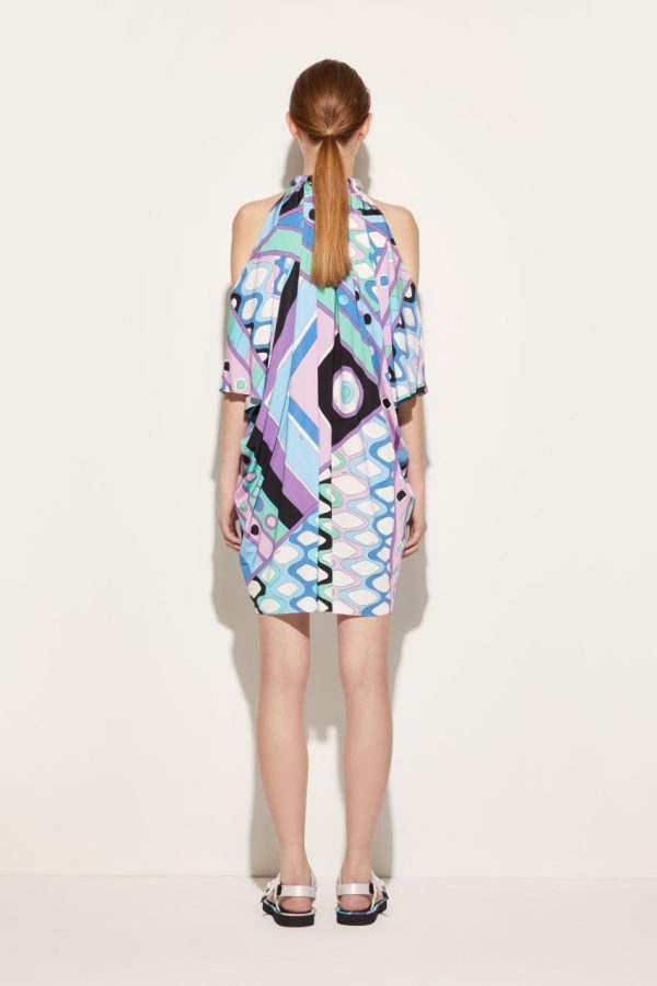Pucci’s short kaftan is characterised by the graphic shapes and pastel colourways of the Vivara print. Cut from lightweight jersey satin, it cascades from a gathered halterneck to draped short sleeves and a mini-length hem.