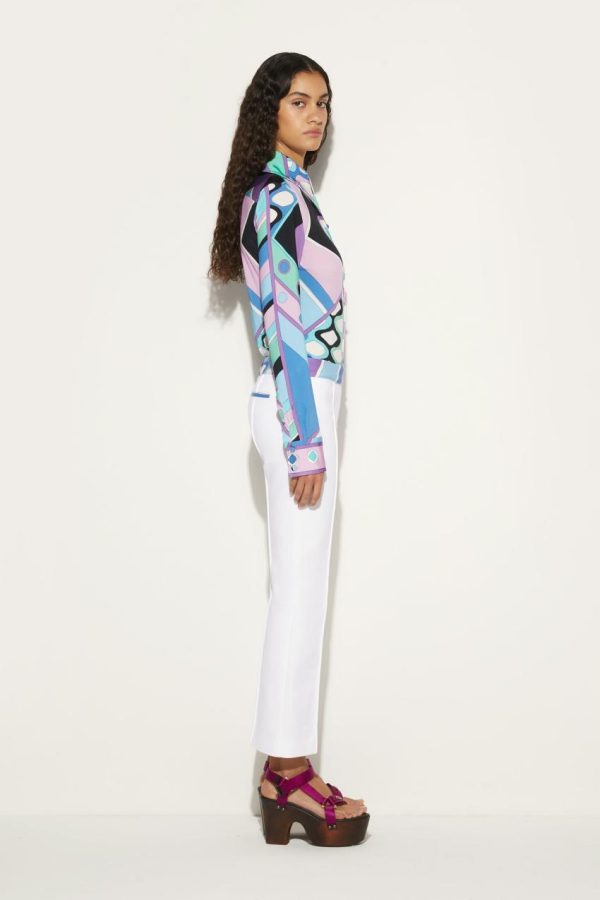 One of over 500 patterns in the Pucci library, a modern iteration of the Vivara print enlivens these white gabardine trousers. Flashes of the archival motif decorate the waist and welt pockets of their straight-leg silhouette.