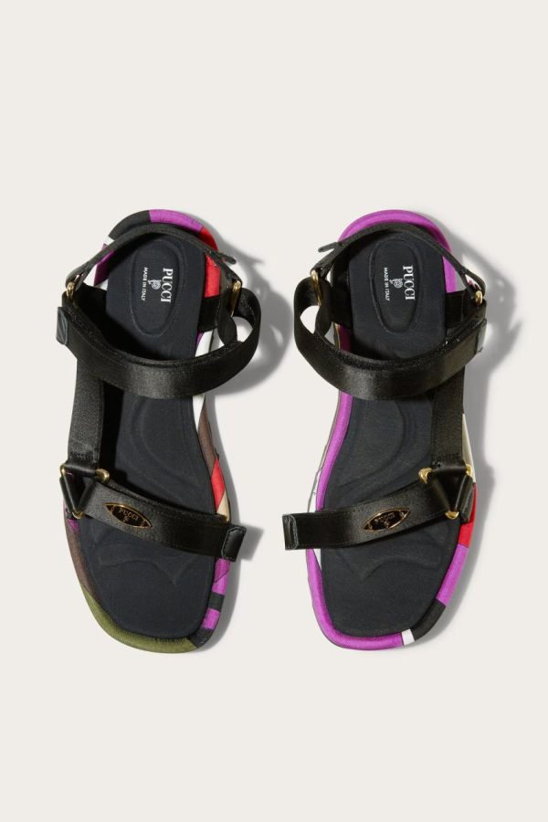 Fitted with adjustable straps, a contoured footbed and a rigged tread sole, these sandals bring Pucci’s adventurous spirit into step. The Iride-print trim is a nod to the house’s storied pattern play.