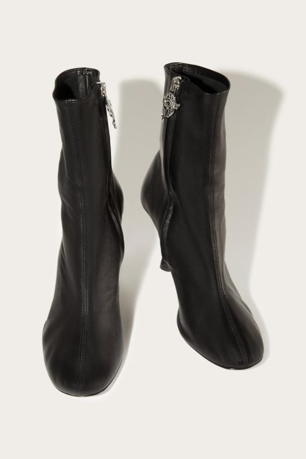 These boots combine a sleek leather upper with a sculptural heel, which is shaped to resemble a horse’s leg. They feature side zip strung with signature Pucci P pulls.