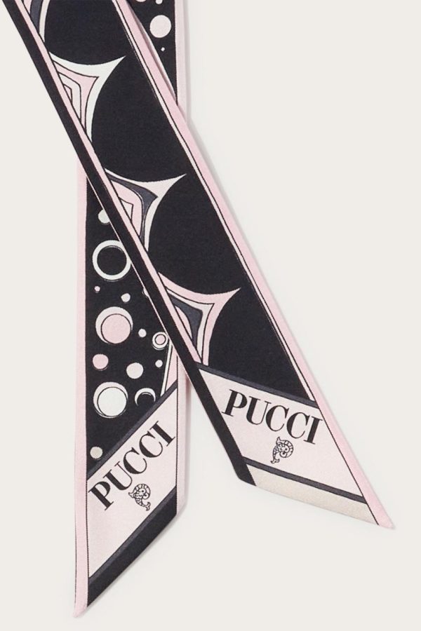 Effervescent and uplifting, the Fontane print covers this scarf in bubbling spheres and splashing curves. It’s cut from silk twill to a slim shape and bordered with Pucci logos: note the house moniker and intertwined fish motif.