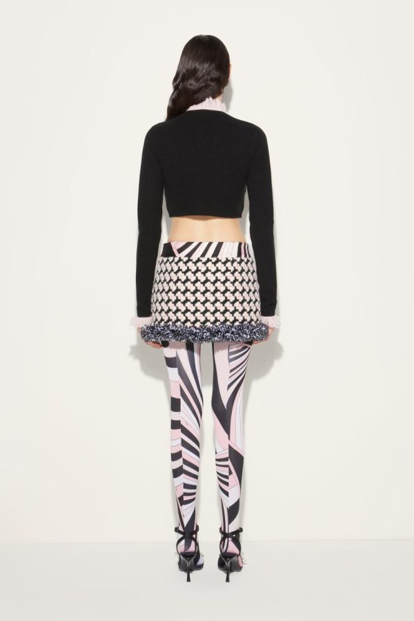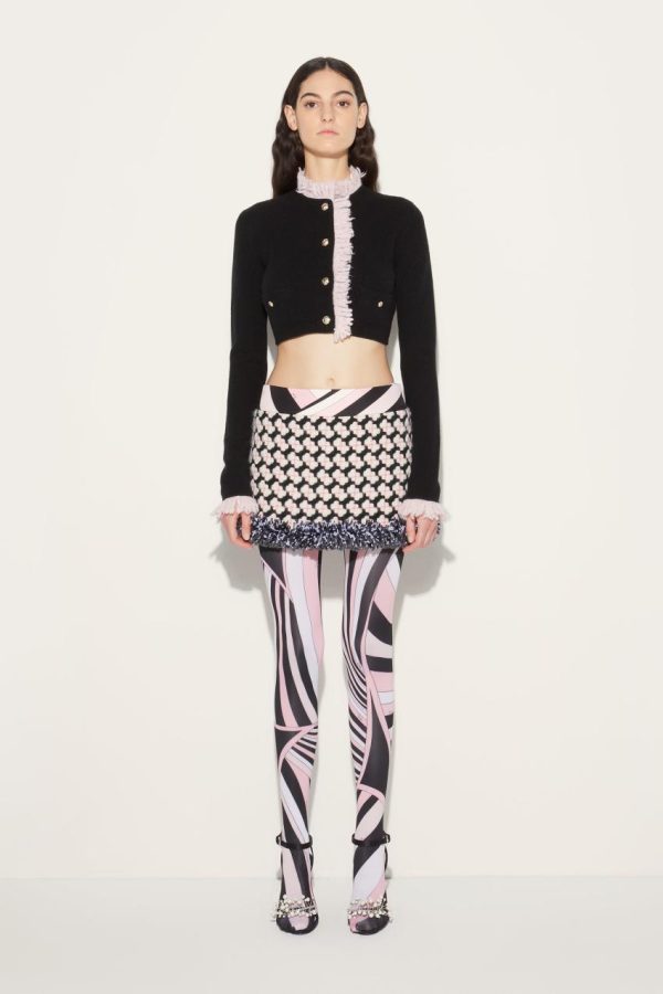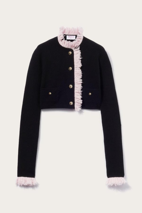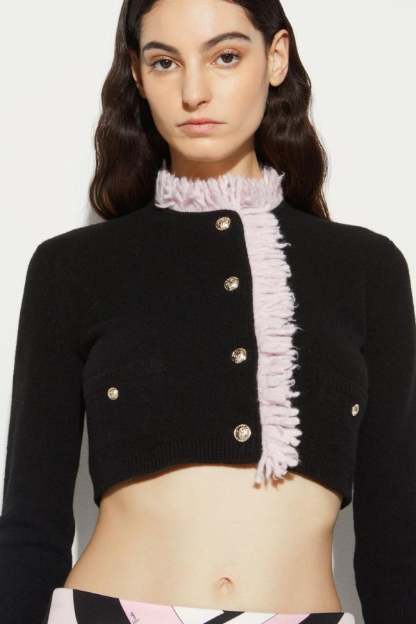 In a signature Pucci twist, pale pink fringing adds playful charm to this black cardigan. It’s crafted from virgin wool and cashmere to a slim silhouette and features gold-tone metal buttons engraved with the Marmo print.