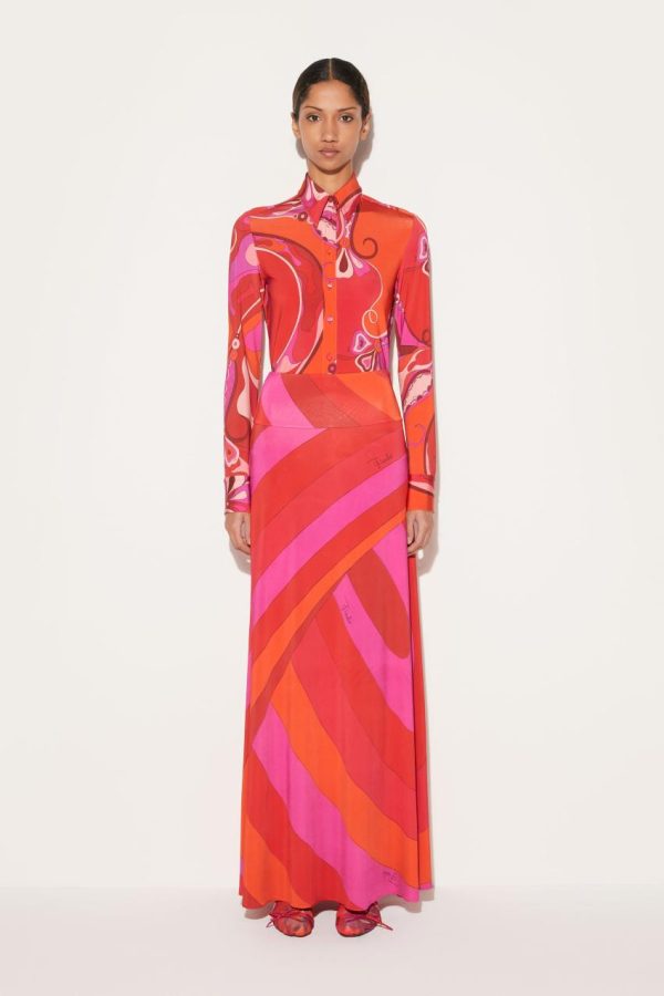 Pucci’s iconic Iride print adorns this long skirt in a variety of bold shapes and bright colours. Its billowing silhouette is crafted from fluid jersey satin and cascades to a floor-sweeping hem.