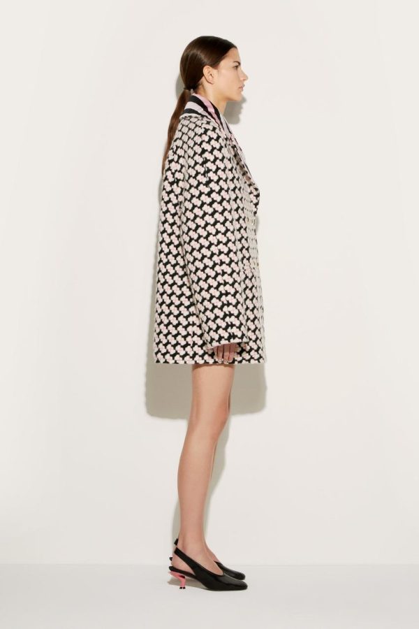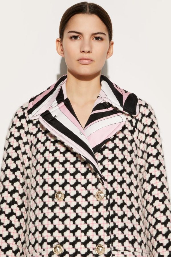 Camille Miceli amplifies Pucci’s pattern play in this retro-inspired trench coat. The lining and oversized notch lapels are stamped with the famed Iride print, while the tweed outer is woven with geometric patterns. Engraved gold-tone buttons complete the maximalist design.