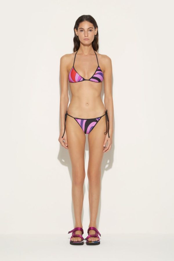 Pucci’s Marmo print – which is inspired by marble’s swirling lines – decorates this bikini top in a bold purple palette. Black trims frame its triangle cups and let the pattern take centre stage.