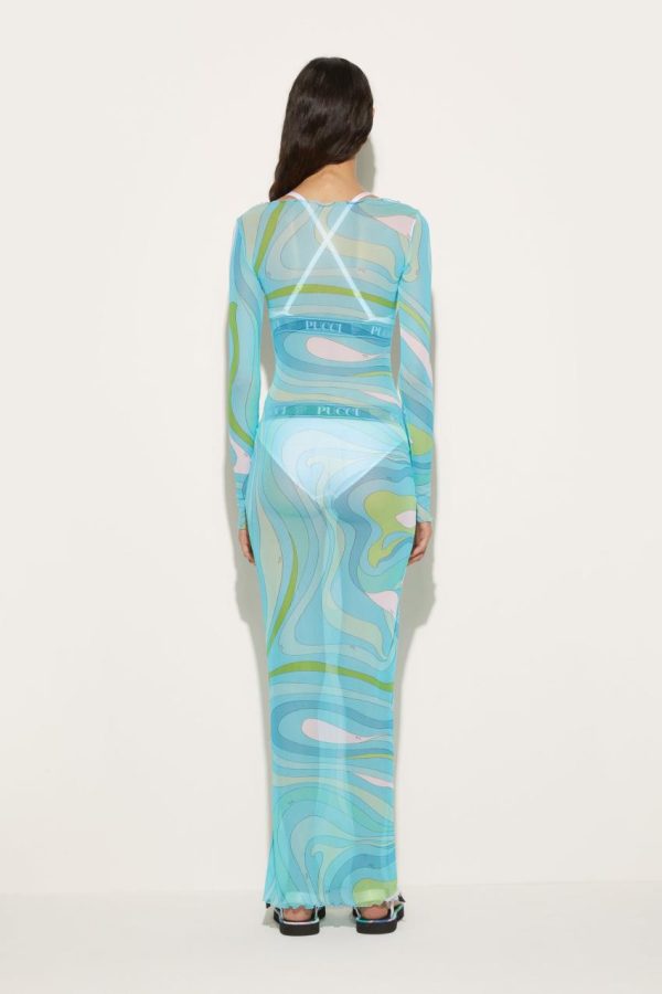 Reminiscent of the Mediterranean Sea, the swirling waves of the Marmo print wash over this dress in turquoise and blue. Its full-length silhouette is detailed with lettuce-hem trims and a semi-sheer finish.
