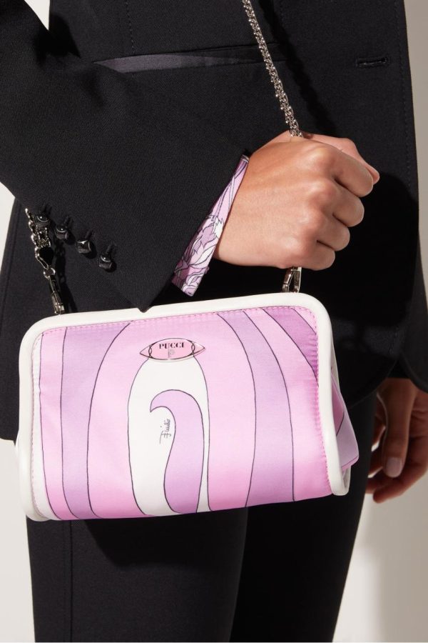 Pucci’s storied Marmo print wraps the Mimi bag in rippling shapes and punchy pink hues. The compact design is finished with smooth leather trims and a vintage-inspired Pesci logo plaque and can be carried as a clutch or worn suspended from the shoulder.